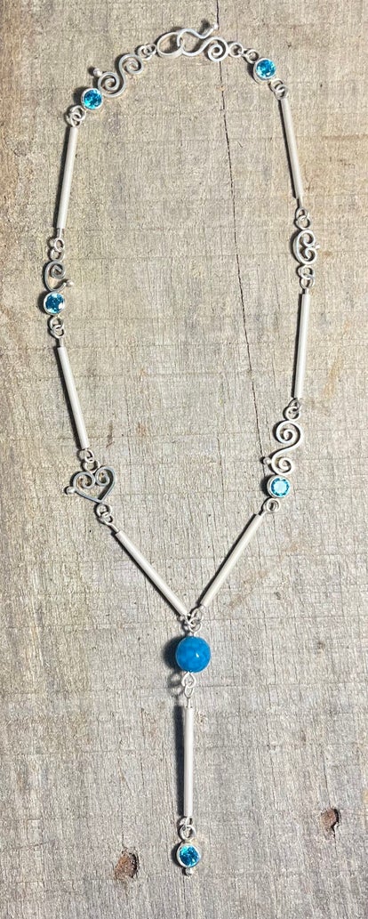 Dit collier is van sterling zilver 925K en heeft 5 blauwe zirconia's van 5,5mm. Handgemaakt.