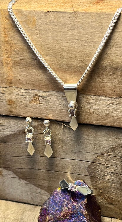 Sterling zilveren 925K set: oorstekers 2cm, ring en ketting met hanger van 2,5cm. Deze set heeft 4 morganiet steentjes van 3mm. De ketting is van 2mm gourmet schakel. De onderdelen van deze set worden niet los verkocht. Handgemaakt.