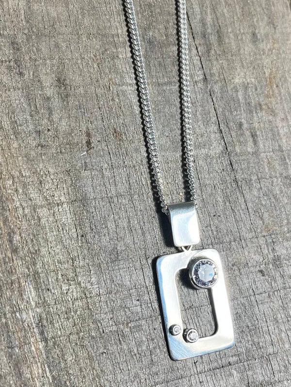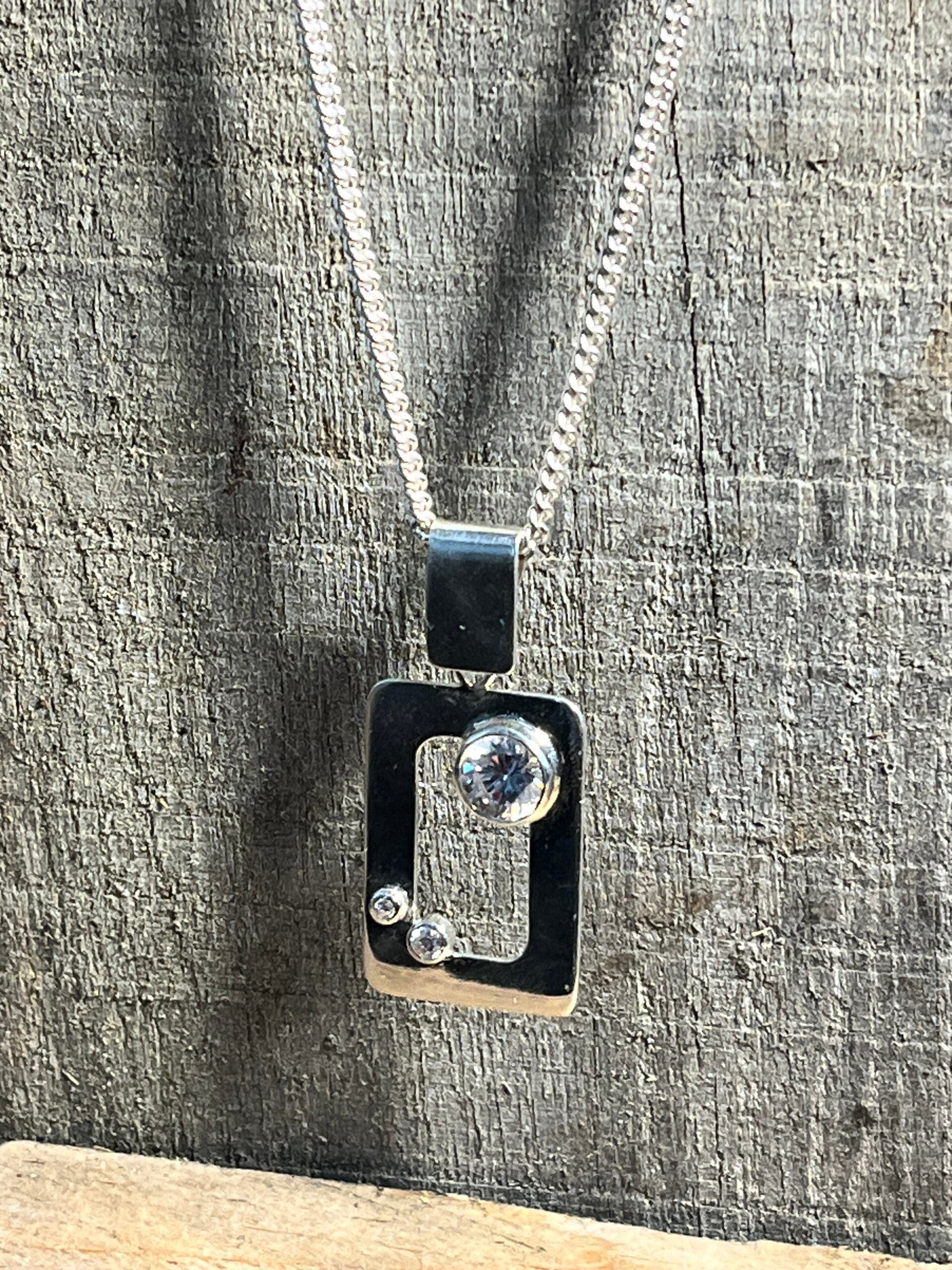 Deze handgemaakte hanger heeft 3 zilconia's van 8,3 en 2 mm. De hanger is van 925K sterling zilver. De ketting is 2,8mm ongeslepen gourmet schakel, 925K zilver.
