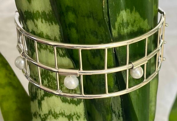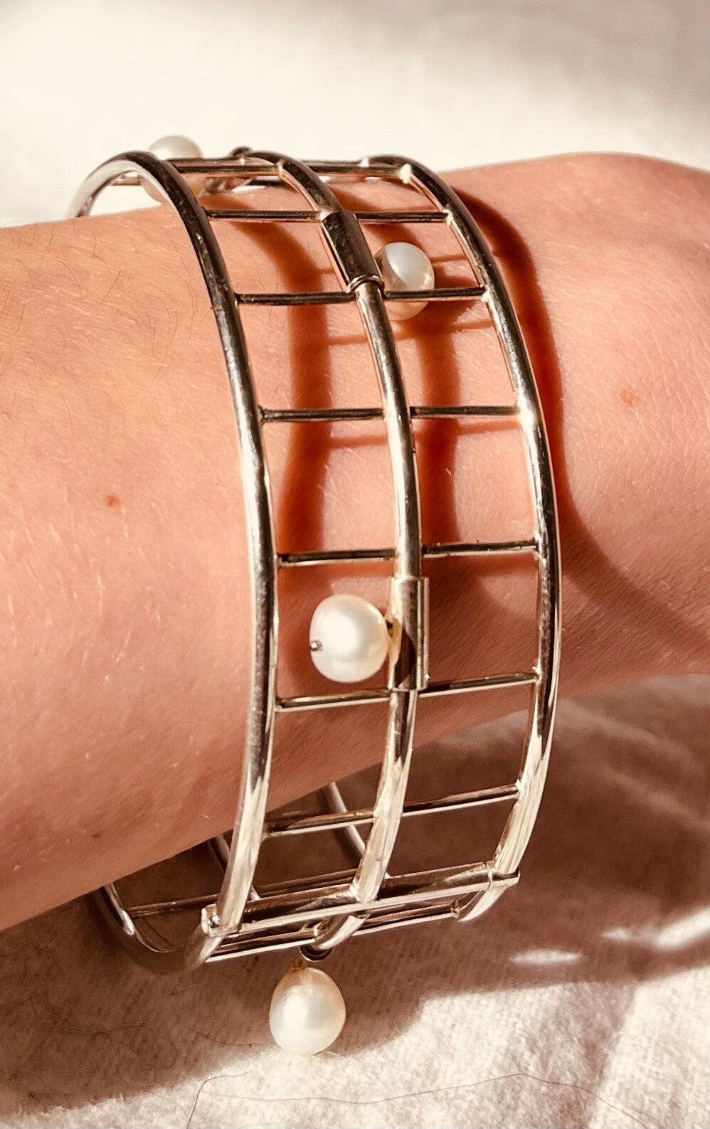 Deze sterling zilveren 925K armband heeft 6 wiebelende rivierparels en is handgemaakt.